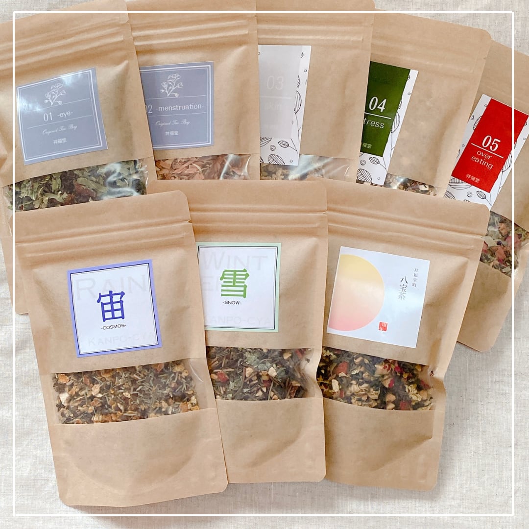 祥福堂の漢方茶を9種類から3つをお選びいただけます。